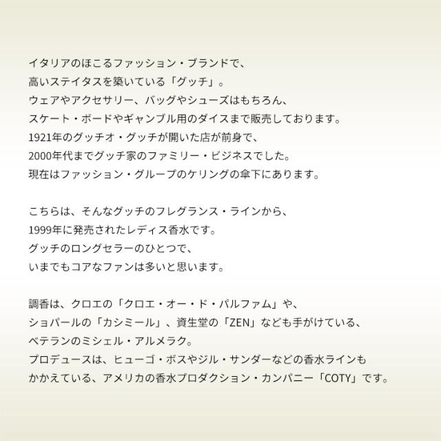 グッチのロングセラーのひとつで、いまでもコアなファンは多いと思います。オー・ド・トワレ(EDT)とパルファン(P)があって、こちらはオー・ド・トワレのほうです。