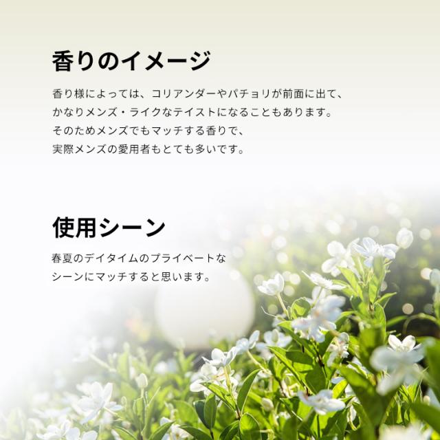 香り様によっては、コリアンダーやパチョリが前面に出て、かなりメンズ・ライクなテイストになることもあります。そのためメンズでもマッチする香りで、実際メンズの愛用者もとても多いです。