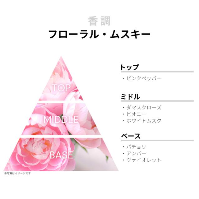 ローズ&ピオニーの濃いフローラルに、ソーピーなニュアンスのムスキーを合わせた感じの一品で、気に入れば末長く愛用できる香りという印象です。