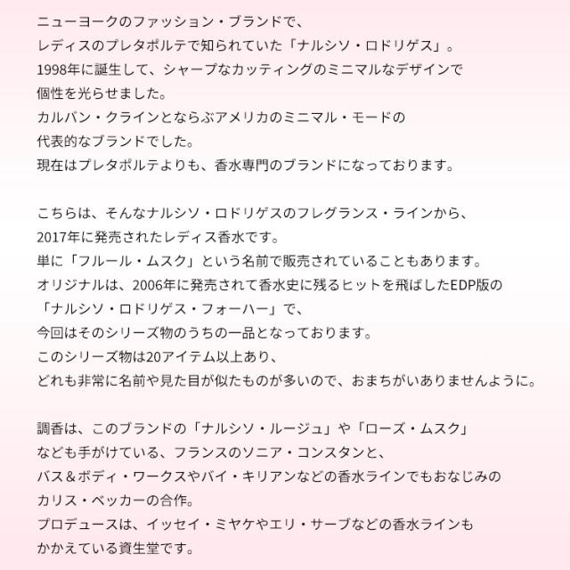 オリジナルは、2006年に発売されて香水史に残るヒットを飛ばしたEDP版の「ナルシソ・ロドリゲス・フォーハー」で、今回はそのシリーズ物のうちの一品となっております。このシリーズ物は20アイテム以上あり、どれも非常に名前や見た目が似たものが多いので、おまちがいありませんように。