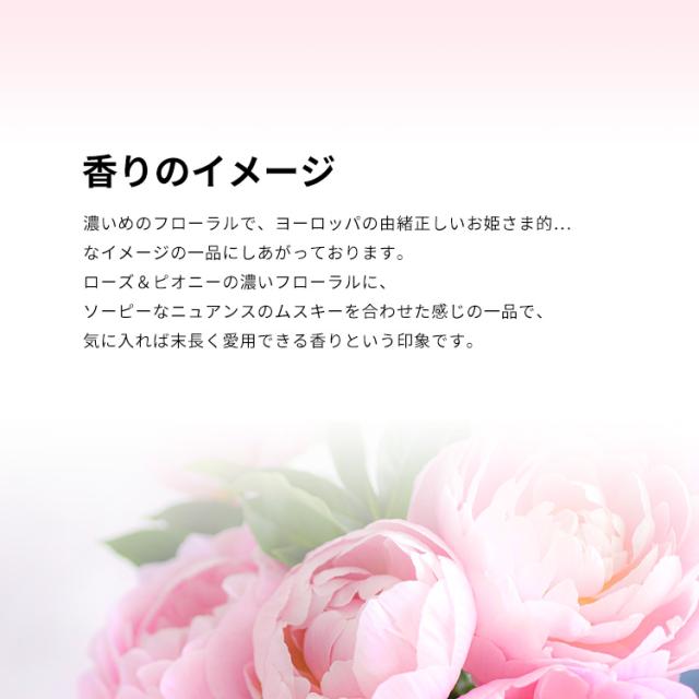 香りは上品なフローラル・ムスキーの香調がベース。濃いめのフローラルで、ヨーロッパの由緒正しいお姫さま的なイメージの一品にしあがっております。