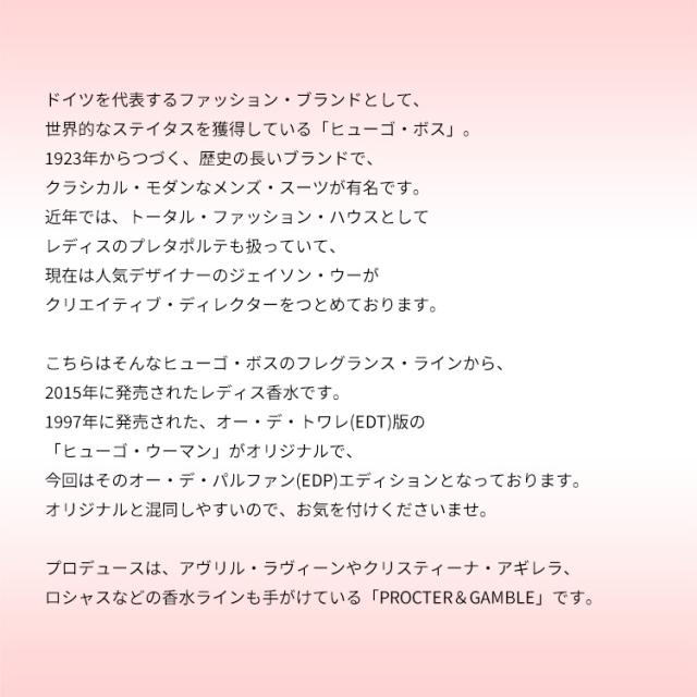 こちらはそんなヒューゴ・ボスのフレグランス・ラインから、2015年に発売されたレディス香水です。1997年に発売された、オー・デ・トワレ(EDT)版の「ヒューゴ・ウーマン」がオリジナルで、今回はそのオー・デ・パルファン(EDP)エディションとなっております。オリジナルと混同しやすいので、お気を付けくださいませ。
