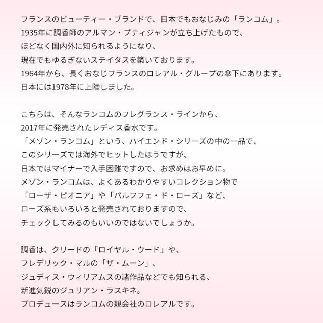メゾン・ランコムは、よくあるわかりやすいコレクション物で「ローザ・ピオニア」や「パルフフェ・ド・ローズ」など、ローズ系もいろいろと発売されておりますので、チェックしてみるのもいいのではないでしょうか。