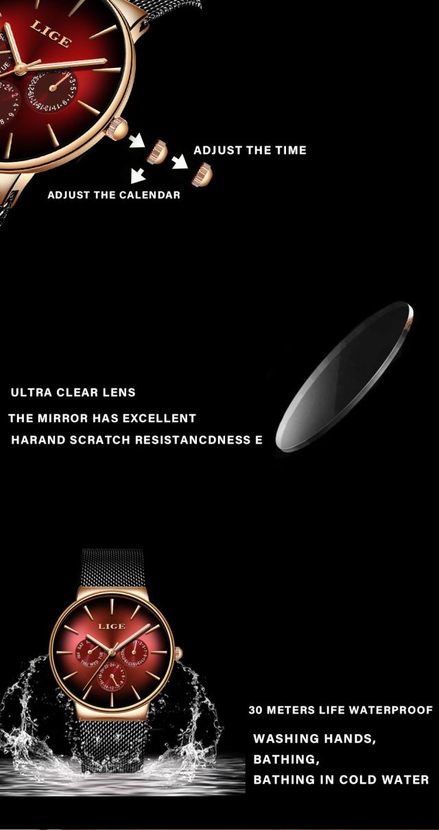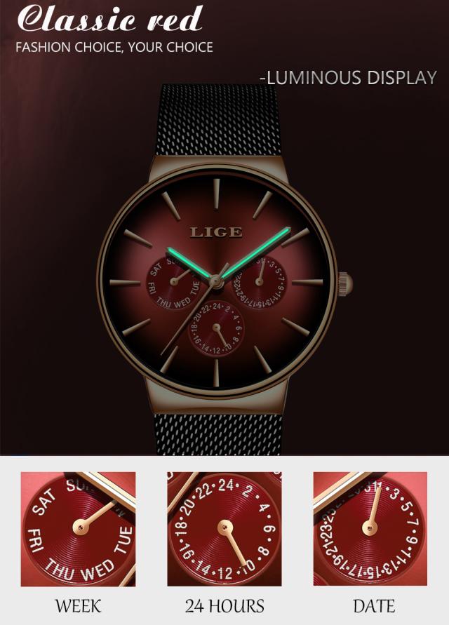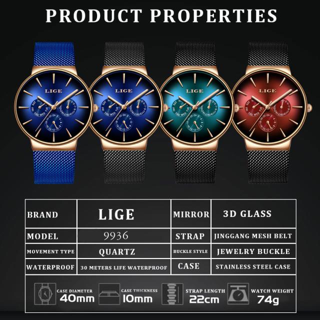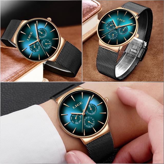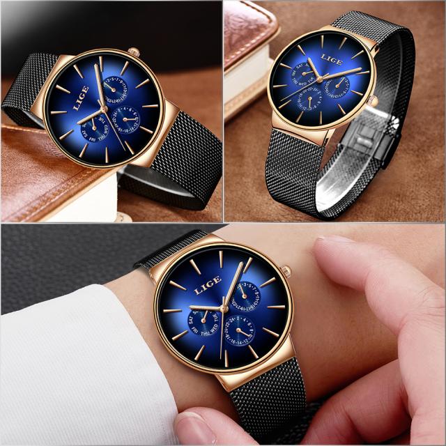 新しいligeファッションメンズ時計トップブランド高級クォーツ時計メンズメッシュスチール防水超薄型腕時計男性用スポーツ時計