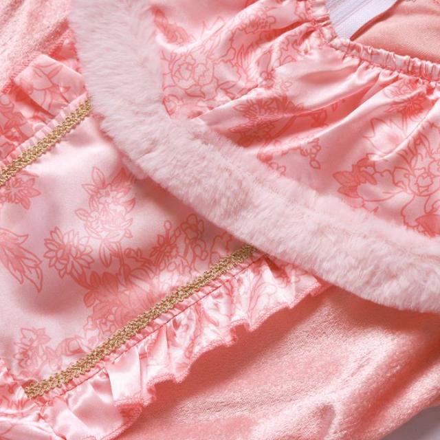 えなこさん着用、周りと差が付くパステルカラーのクリスマスコスチューム、シェリヴェール。光沢が美しいクラッシュベロアにファーやパールを掛け合わせた、クリスマスにぴったりの贅沢なシリーズです。珍しいコーラルピンクのサンタコスチューム。くすみピンクのファーと花柄サテンを組み合わせ、とことんガーリーに仕上げました。定番のサンタ帽はふわふわとしたポンポンがアクセント。デコルテのパールリボンは後ろで結ぶ仕様なので体型に合わせて長さを調節できます。ファー付きのフリルは肩に乗せてもオフショルダーでも着られる2WAY仕様。胸の豪華なゴールドブレードとプリンセスのようなスカートにも注目。手首のファーがキュートなショートグローブ付き。後ろウエストはゴムを入りなのでスッキリとしたシルエットで着用できます。