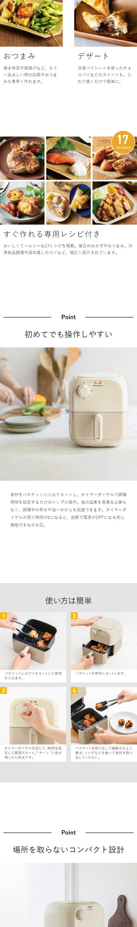人気の「 recolte エアーオーブン 」にコンパクトサイズが登場。ヘルシーな揚げ・焼き調理ができ温め直しや冷凍食品、スイーツ作りもOK。1食分のおかずやお弁当作りまで毎日役立ちます。