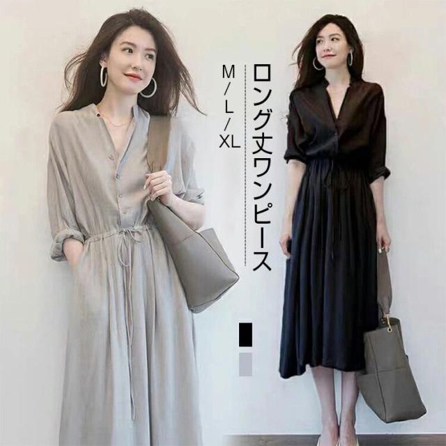 Vネック ロングワンピース シャツワンピース レディース 春 夏 秋 ミモレ丈 ロング丈 ワンピース 無地 リボン付き Aライン 綺麗 大きいサイズ 通勤 入園式卒業式 敬老の日 プレゼント