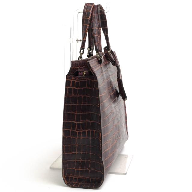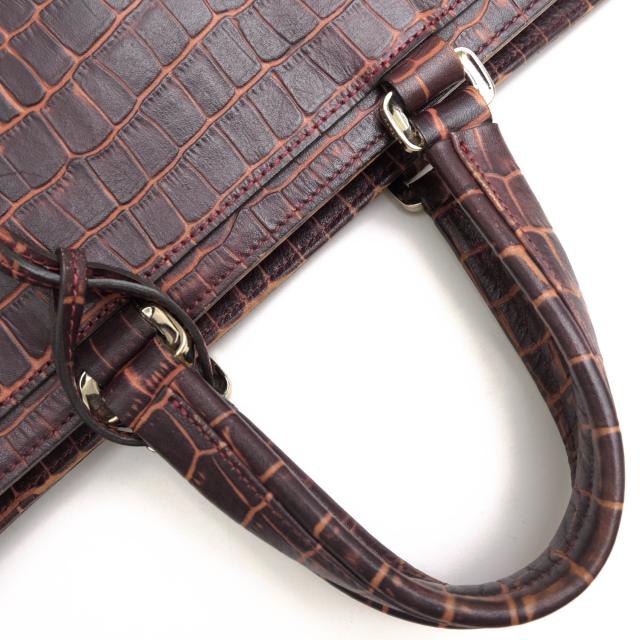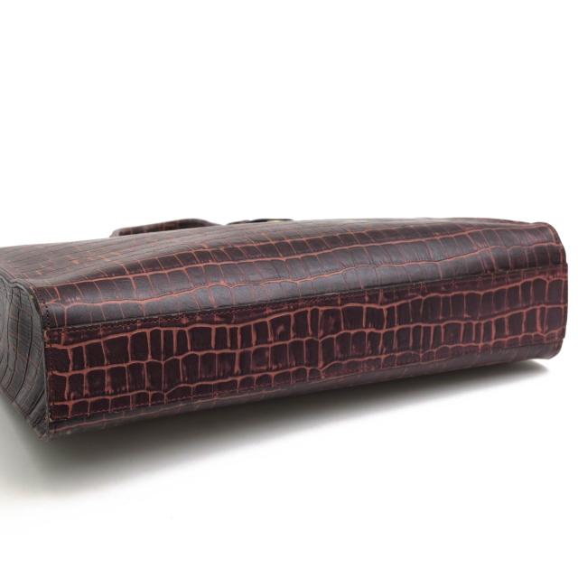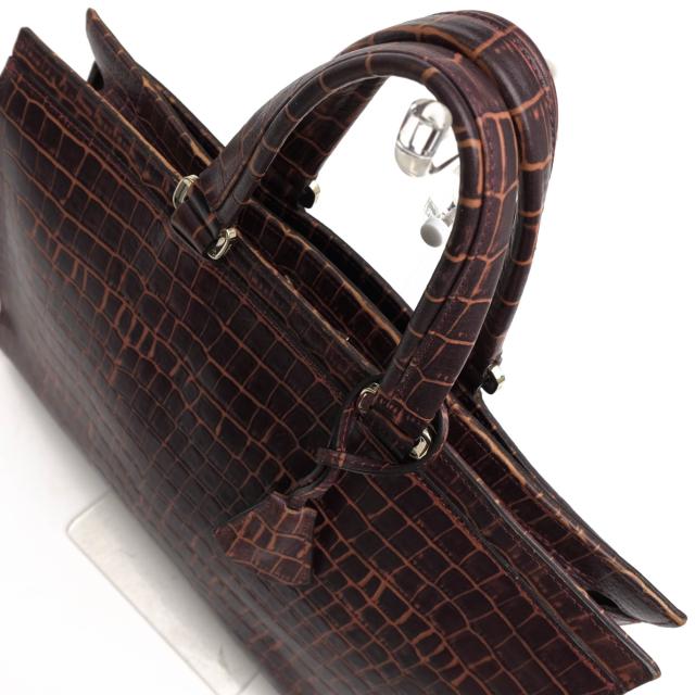 ヴィンテージ感と優雅さを併せ持つクロコエンボスの牛革型押しを採用した上品なブリーフケース。革の自然なオイル分を活かした独特の製法で作られており、1〜2年かけて熟成させた後、職人による手作業でナチュラルなしなやかさと極上の張り感を実現しています。デザイン面では、シャープなシルエットと端正なルックスが特徴で、サイズ感はA4サイズの書類がぴったり収まる小ぶりな作りで、ビジネスシーンに最適です。内部には、効率的な整理が可能な2つの小分けポケットと1つのファスナーポケットを装備。外側にはシンプルながら機能的なあおりポケットがあり、日常のビジネスツールをすっきりと収納できます。