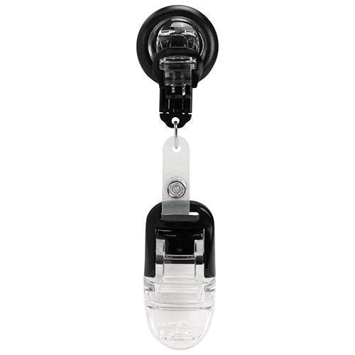 ワンタッチクリップで簡単に脱着可能です。伸縮可能なリール付きで挟んだまま使用できます。リールはボタンを押して抜くとワイヤーが伸縮し、伸縮の必要がないときはカチッと音がするまで差し込みます。