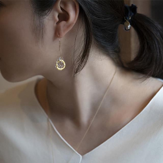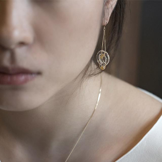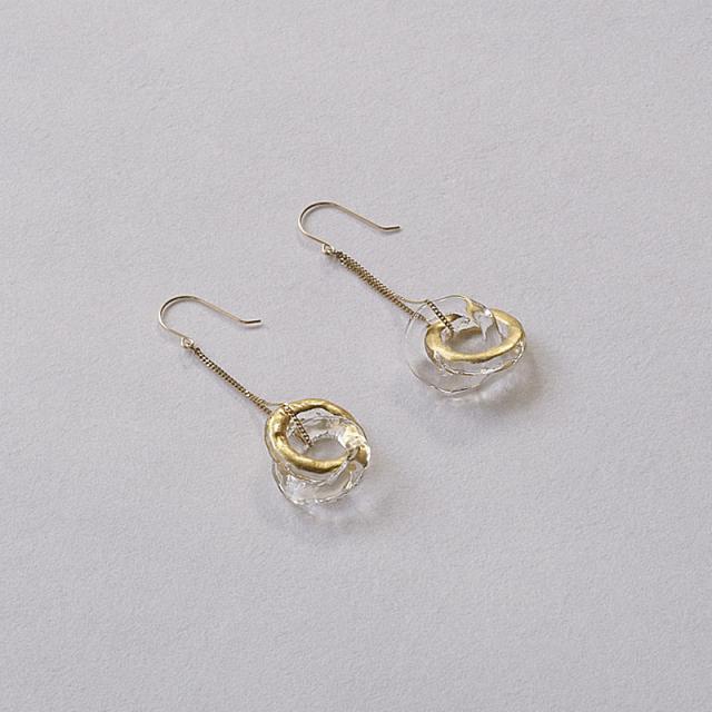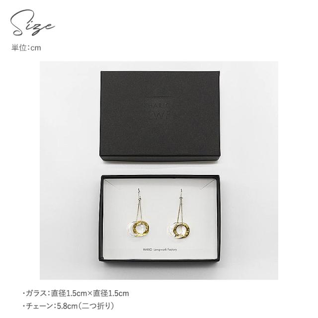 HARIO Lampwork Factoryの金箔を施したシリーズ「Haku」のピアス。異なった表情を持つ二つのリングが重なったデザインで、耳元に特別なきらめきを添えます。金箔は、金沢にて職人がひとつひとつ手づくりでガラスに貼っており、日本の職人の技がつまった素晴らしい作品です。