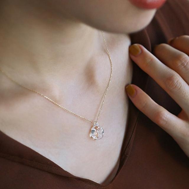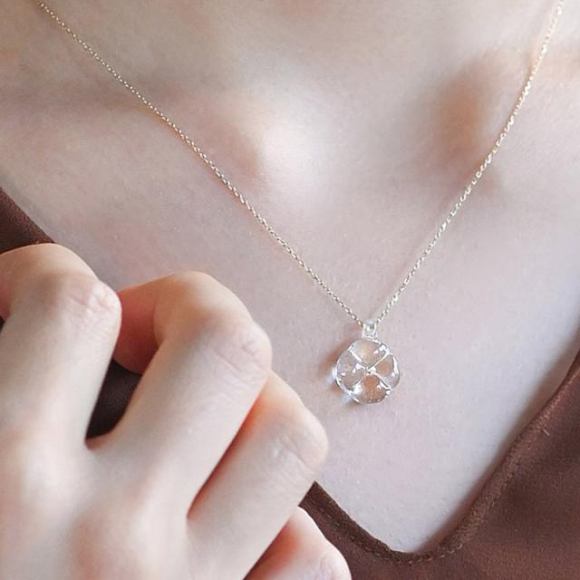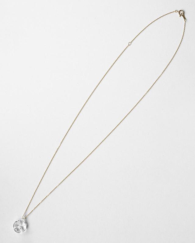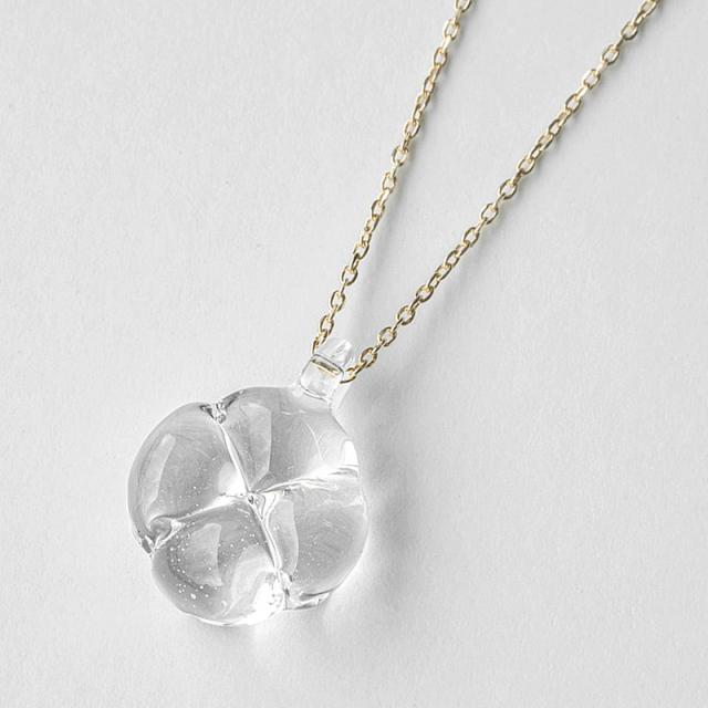 光にふれて浮かびあがるお花のシルエットがかわいいネックレス。ガラス×ゴールドのコンビネーションが軽やかなイメージを演出し、装いにバランスよく馴染みます。