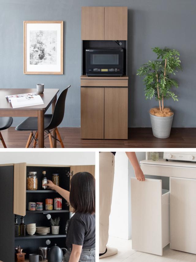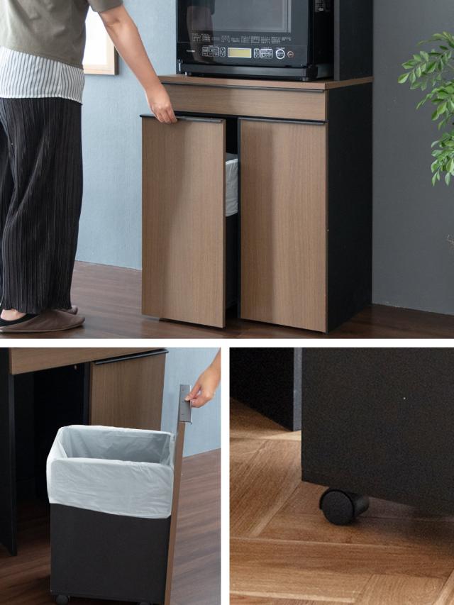 一見ゴミ箱に見えないスタイリッシュなデザインと使い勝手の良さが特徴の分別ダストボックスラックです。扉収納やオープンスペースには、電子レンジや食器、調味料などをまとめて収納できます。