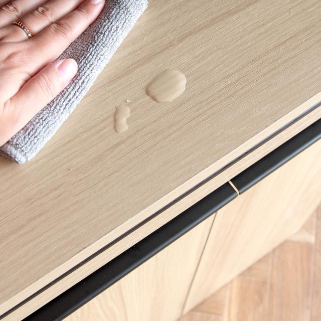 スペースの天板や扉は水や傷に強い合成樹脂製です。濡れてもサッと拭き取れるので、お手入れが簡単です。長く使えるこだわり素材を使用しています。