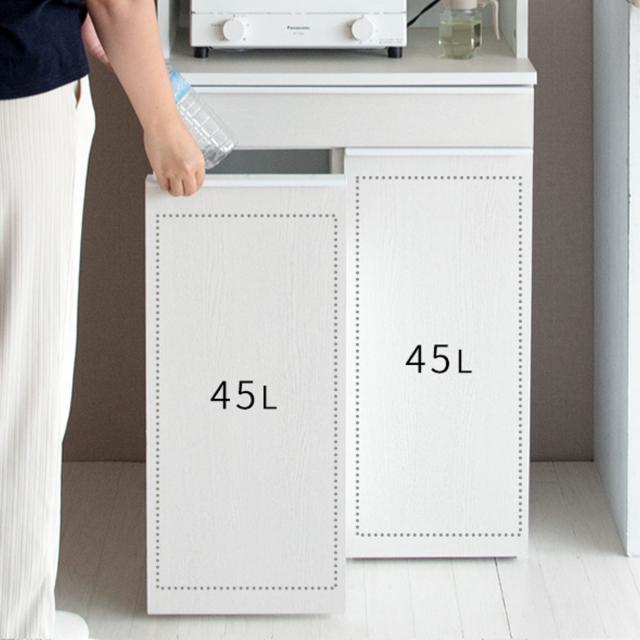 たっぷり入る容量45リットルのゴミ箱が2杯並んでいます。プラスチックやペットボトル、ビンや生ゴミなど分別が必要なゴミが多く出るキッチンに最適です。