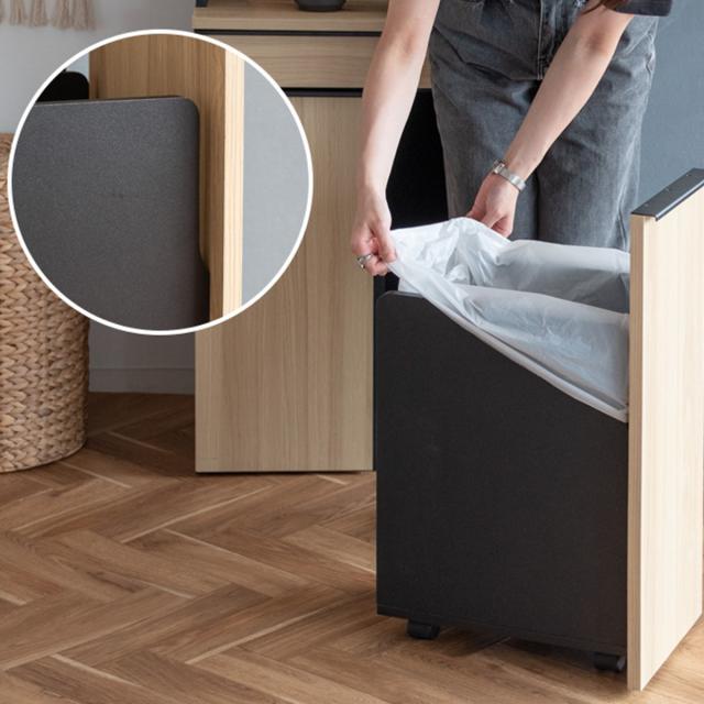 ゴミ箱には小回りの利くキャスターと掴みやすい取っ手が付いています。ゴミを捨てる時だけサッと引き出せるので、気になるニオイ漏れを防げます。隠しキャスターのデザインで見た目スッキリです。