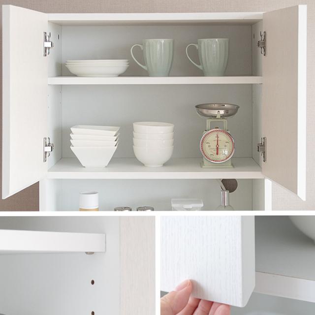 ラック上部の扉付き収納棚は、ホコリの侵入を防げるので食器収納や食品の暗所保存に最適です。収納するものに合わせて3段階で高さ調節できる可動棚が付いています。