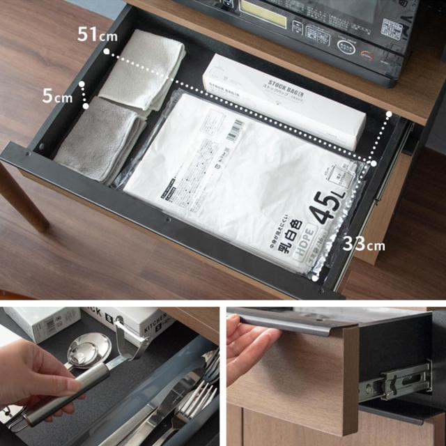 ゴミ箱上にはゴミ袋のストックや布巾、カトラリーなどが収納できる浅い引出しがあります。フルスライドレール式でスムーズに引き出せます。