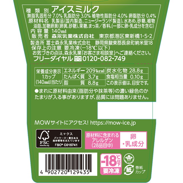 商品名 [アイス] 森永乳業 MOW 宇治抹茶 140ml×6個 容量 140ml×6個 原材料名 乳製品(国内製造、ニュージーランド製造)、水あめ、砂糖、植物油脂、加糖卵黄(卵黄、砂糖)、果糖、まっ茶/香料、(一部に卵・乳成分を含む) アレルギー特定原材料 卵、乳 保存方法 要冷等(-18℃以下)