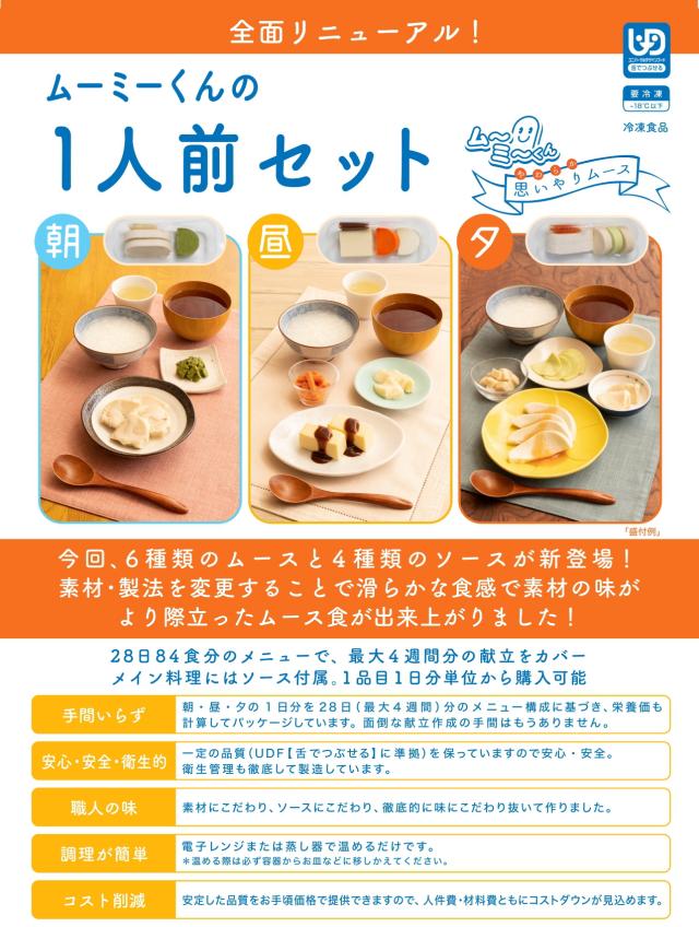 【介護食】冷凍 ムーミーくん1人前セット 4週間分 84食入り(1週目〜4週目) 1食あたり約327円 ムース食 区分3 舌でつぶせる ミキサー食 刻み食 嚥下食 やわらか食 ペースト食 介護 食 日本ケアミール 当日発送