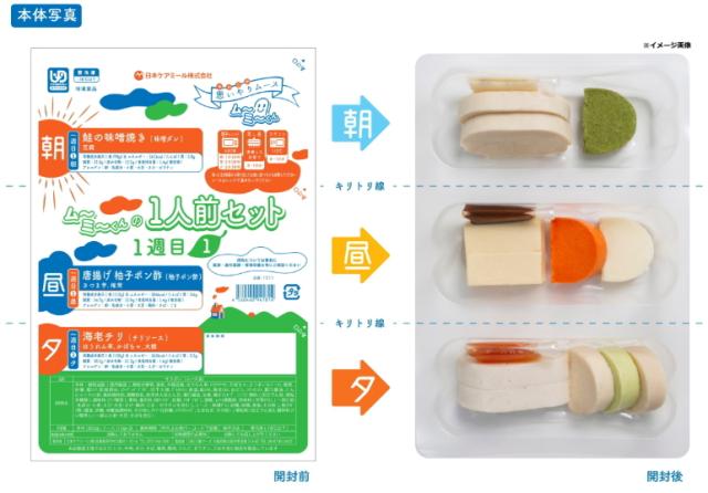 \舌でつぶせるやわらかさのムース食!1パックに朝・昼・夕食の3食分が入っています/