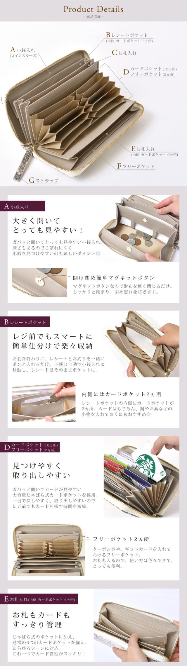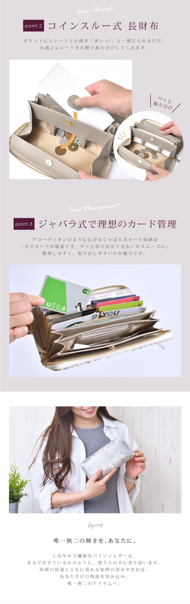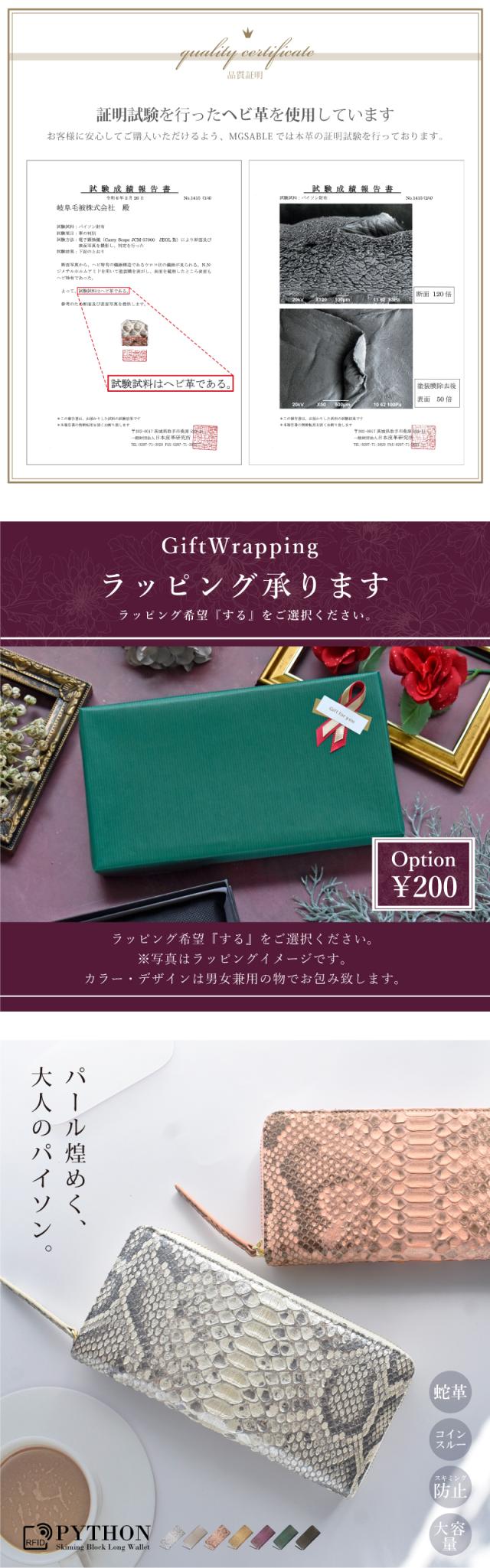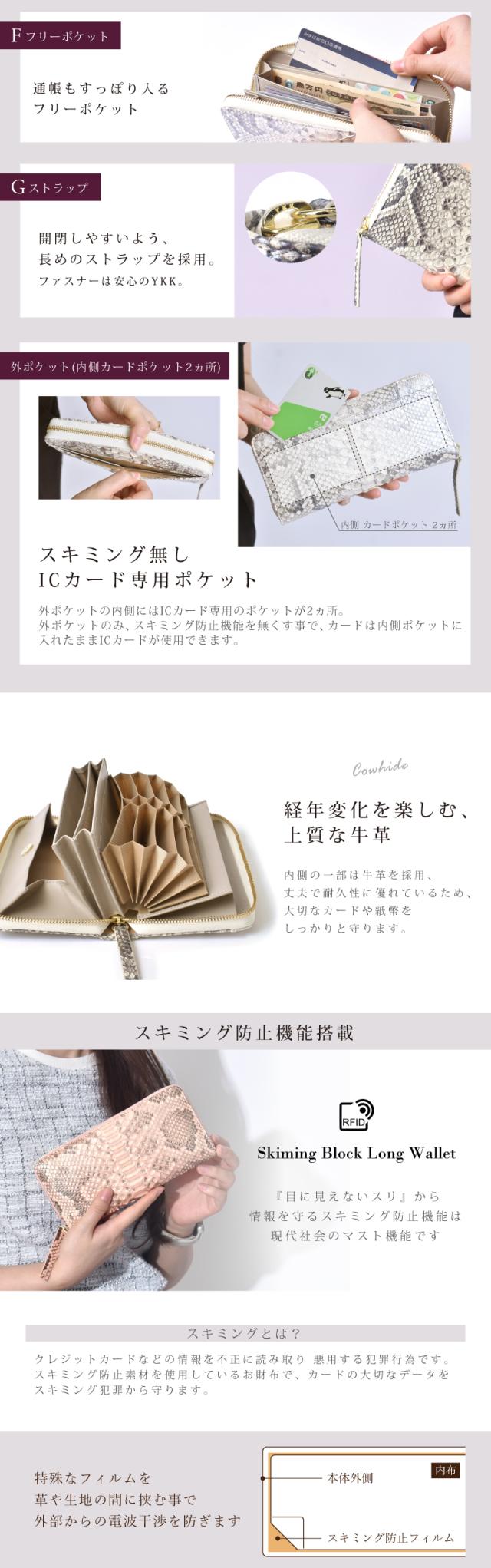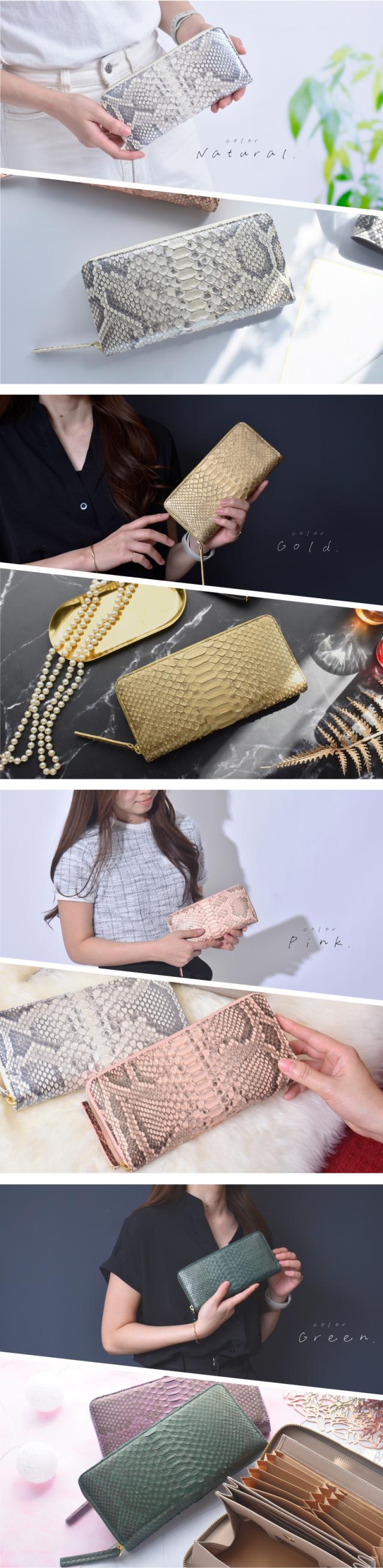 | 特徴 | 【パール加工】 艶やかなパイソン本革に、繊細なパール加工が加わり 洗練されたデザインに仕上がりました 控えめな光沢が持つ人の個性を引き立てます 【機能的で実用的】 ポイント.1 「大容量」の収納力 大量のカードや紙幣をすっきり収納できる大容量設計。 財布を開けば180度大きく開くので、中が見やすく、見つけやすい。 必要なものがサッと取り出せます。 ポイント.2 コインスルー式 長財布 ポケットにレシートと小銭を「ぽいっ!」と一緒に入れるだけ、 小銭とレシートを自動で振り分けしてくれます。 ポイント.3 ジャバラ式で理想のカード管理 アコーディオンのように広がるじゃばら式カード収納は 一目でカードが確認でき、サッと取り出せて支払いがスムーズに。 整理しやすく、取り出しやすいのが魅力です。 “唯一無二の輝きを、あなたに。” しなやかで繊細なパイソンレザーは、 まるで生きているかのように、使う人の手に寄り添います。 時間の経過とともに現れる独特の深みや光沢は、 あなただけの物語を刻み込み、 唯一無二のアイテムへ。 【スキミング防止機能搭載】 『目に見えないスリ』から情報を守るスキミング防止機能は現代社会のマスト機能です “スキミングとは?” クレジットカードなどの情報を不正に読み取り 悪用する犯罪行為です。 スキミング防止素材を使用しているお財布で、カードの大切なデータをスキミング犯罪から守ります。 特殊なフィルムを革や生地の間に挟む事で外部からの電波干渉を防ぎます 【カラー】 あなただけの特別な一色を。 お財布を開くたび、気分が上がる。インナーカラーにもこだわりを。 【幸運を呼び込む蛇革】 -蛇革が縁起物と呼ばれる理由- 『蛇の財布が金運をアップする』と言われるのは、蛇が古来から富や繁栄の象徴とされており、 その皮が滑らかで美しいため風水的にも金運を引き寄せると信じられているからです。 また、魔術的な信念やシンボリズムによって、蛇の皮で作られた財布が金運を増幅させると考えられています。 これらの理由から、蛇の財布が金運に良い影響を与えると信じられています。 【パイソンマテリアル】 天然の優しい手触りと美しさ使うほどに美しい艶色味に深みが生まれます。 パイソンの特徴はこの個性的で美しいウロコ模様にあります。 ラグジュアリーな雰囲気があり、エキゾチックレザーならではの表情をお楽しみ頂けます。 繊細な見た目ではありますが、鱗が剥がれたりする事はありません。 使うほどに何とも言えない色味に深みが生まれ、艶が増していきます。 【“革の表情”について、ご購入前にご確認下さい。】 本製品は天然の素材を使用しておりますので、キズやシワなども入っている場合がございます。 これらは本革ならではの個体差によるものと、2つとない表情を魅せる革の個性であるため、 風合いをお楽しみ頂けると幸いでございます。 ・小傷・革スレ・革切れ・鱗浮き・鱗の大小あり・色ムラ・鱗のゆがみ・黒点、汚れ ※ひどく目立つものは除いて、ある程度は革の個性としてそのまま出荷・発送致します※ ※上記のような革の個性による返品・交換は原則お受け致しかねますので、予めご了承下さいませ |