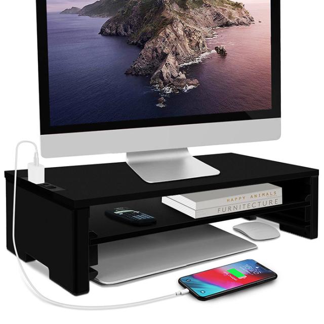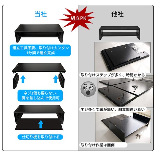 モニター台として使う場合、モニターが約145mm高くなります。これによって、視線が高くなり、 目の疲労、背中と頸椎の疲労も軽減でき、作業効率も向上します。