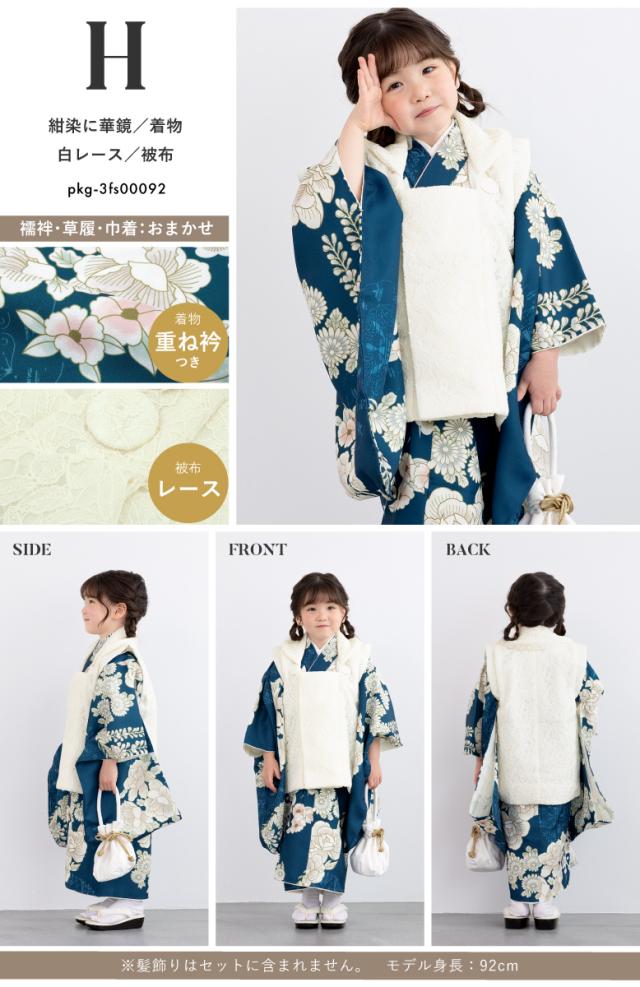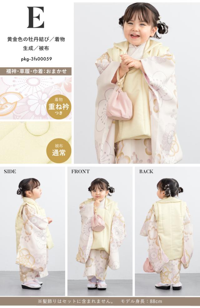 内容は【被布コート・着物(重ね衿縫付済)・長襦袢(半衿付済)・草履・巾着】です。