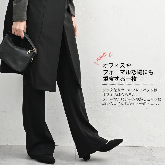 フォーマルの場でも活躍する 美シルエットフレアパンツ。 股上深め設計だから動きのあるシーンも安心。 オフィスやフォーマルな場にも 重宝する一枚です。 |