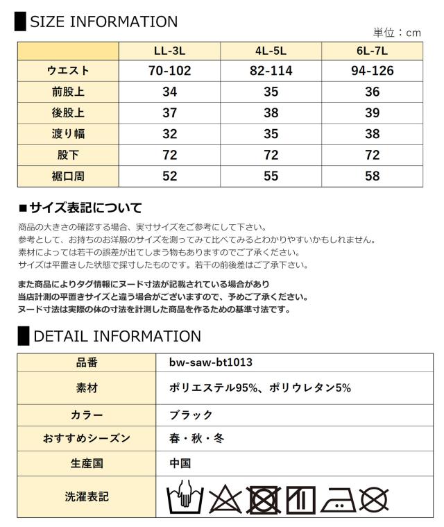 LL-3L:総丈106 ウエスト70-102 ヒップ106 前股上34 後股上37 股下72 渡り幅32 裾口周52