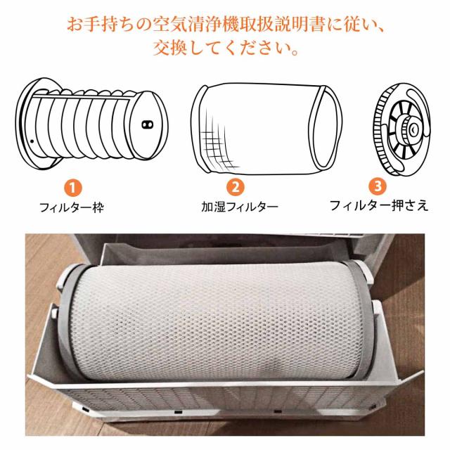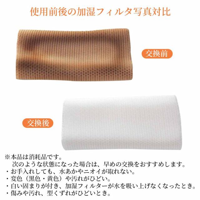 | ※本品は消耗品です。加湿フィルター次のような状態になった場合は、早めの交換をおすすめします。 ・お手入れしても、水あかやニオイが取れない。 ・変色(黒色・黄色)や汚れがひどい。 ・白い固まりが付き、加湿フィルターが水を吸い上げなくなったとき。 ・傷みや汚れ、型くずれがひどいとき。 |