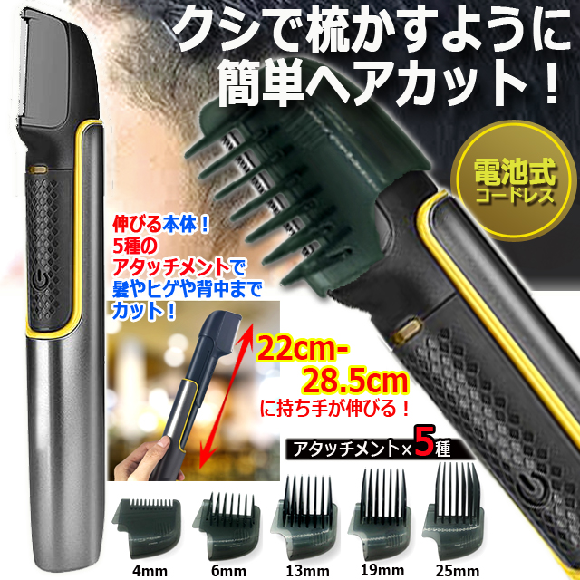伸びる本体!5種のアタッチメントで髪やヒゲや背中までカット!