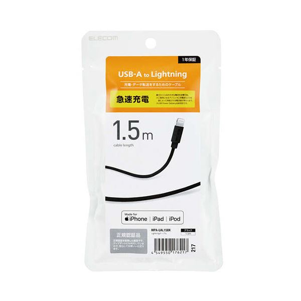 商品仕様: エレコムスタンダードLightningケーブル ブラック 黒 1.5m RoHS指令準拠(10物質) MPA-UAL15BK 1本