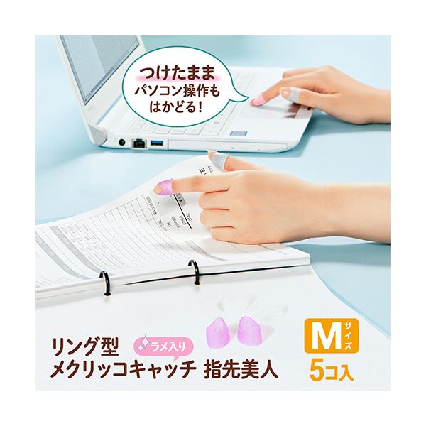 つけたままパソコン操作もしやすい形状のリング型指サック。ラメ入りで指先キラキラ。