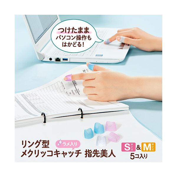 つけたままパソコン操作もしやすい形状のリング型指サック。ラメ入りで指先キラキラ。