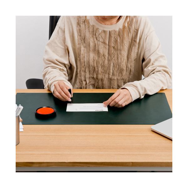 透明のデスクマット以上の高級感、本革マットや役員向けレザー調マットよりカジュアルに使用できるデスクマットです。