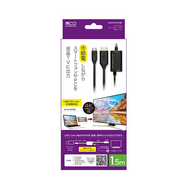 商品仕様: ナカバヤシ ミヨシPD対応Type-C to HDMIケーブル 1.5m USD-PFH15/BK 1本