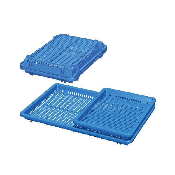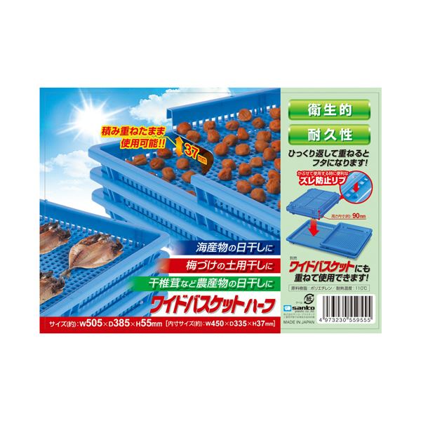 ●梅漬けの土用干しや、海産物の日干しに。洗えるので衛生的で耐久性に優れる。積み重ねて使用可能なワイドバスケットハーフ。
