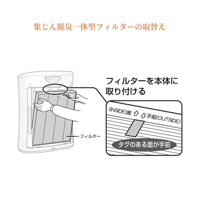 ※空気清浄機フィルターの集じん・脱臭能力について ・タバコの有害物質(一酸化炭素等)はすべて除去できません。 ・常時発生し続けるニオイ成分(建材臭・ペット臭等)はすべて除去できるわけではありません。 ・タバコや焼肉など、強いニオイがある時にお使いになると、数週間から数ヵ月でフィルターからニオイが発生し、フィルター交換が必要になる場合があります。このような使い方をされるときは、お部屋の換気と併用してお使いいただくことをお勧めします。 |