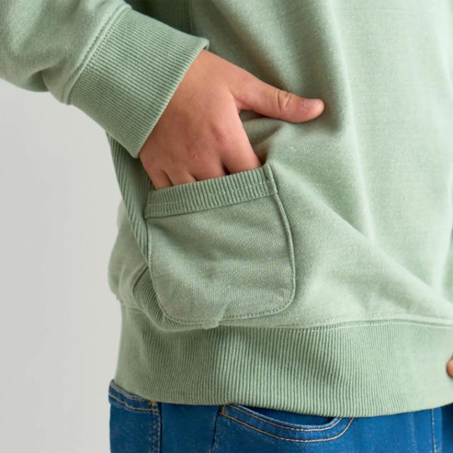 リサイクルコットンの"Ferre Yarn(フェレヤーン)"の滑らかな柔らかい着心地で、動きやすさを求める方におすすめ。裏毛仕様で着用期間も長く、ポリエステルを混紡する事で生地に強度としなやかさをプラス。 サイドパネルはリブ素材を使用して、ストレッチ性を高め体へのフィット感を向上し、わんぱくなお子さんの動きにも対応。