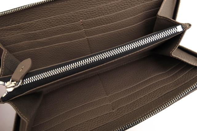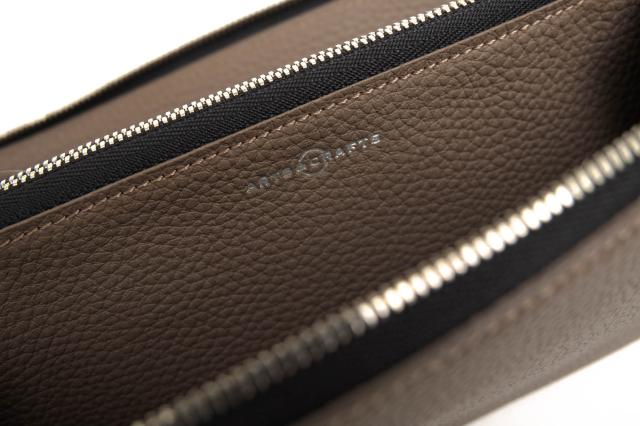 『SHURUNKEN CALF ACC』シリーズのラウンドファスナー長財布は、高品質のドイツ・ぺリンガー社の『シュランケンカーフ』革を使用。自然なシボと独特のタッチ感が魅力で、職人技が光る仕上がり。収納部は広く、全体が見やすく、小銭入れはマチ付きで使いやすい仕様。カードポケットは合計21枚あり、3層のスペースで整理しやすい設計。外部にはカードポケットが備わっており、ICカードなどの収納に便利です。