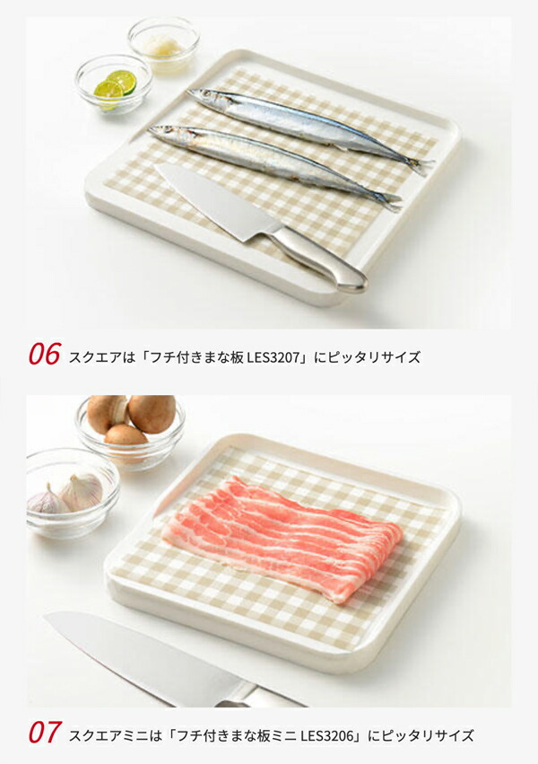 まな板を洗う手間が省ける 好評のまな板シートにスクエアタイプが登場。スクエアとスクエアミニの2サイズをラインナップ。 ・気になる生魚や生肉の雑菌対策に ・色移り防止に ・カットの目安になる縦横1cmの模様入り ・ワックスペーパーとしても ・スクエアミニは「フチ付きまな板ミニ LES3206」にピッタリサイズ |