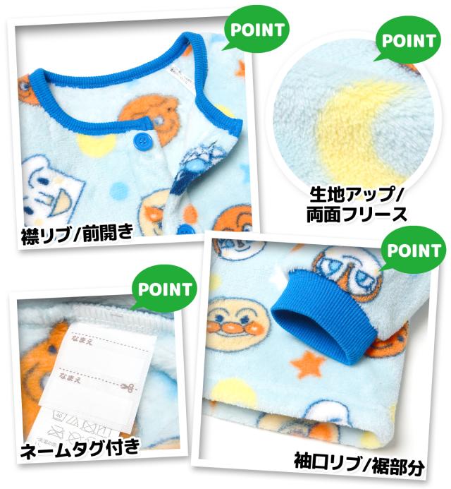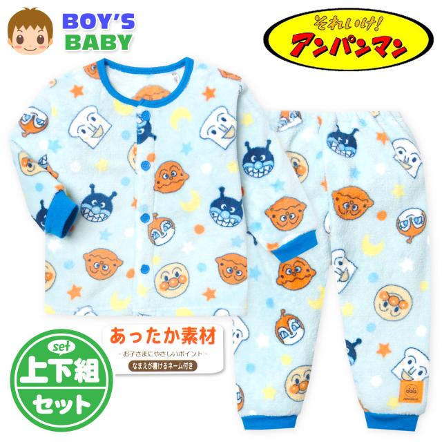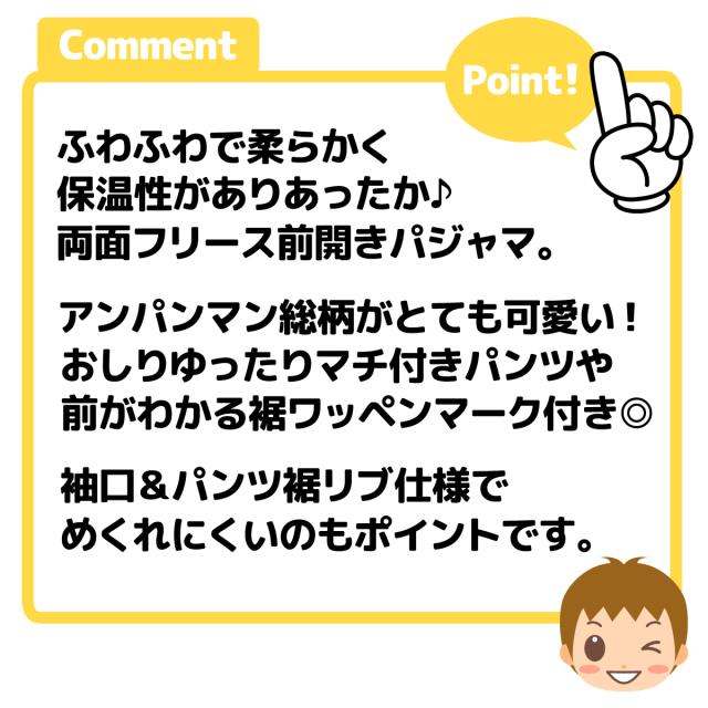 【送料無料】男児 ベビー フリース 長袖 パジャマ アンパンマン 前開き あったか素材 保温 上下組 後ろマチ 前がわかるマーク付 ベビー服 男の子 80cm 90cm 95cm iw-1187-sx【メール便対応】