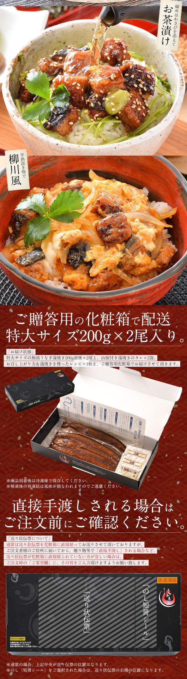 うなぎ蒲焼200g×2尾、タレ&山椒(タレ10g、山椒末0.2g)×2袋