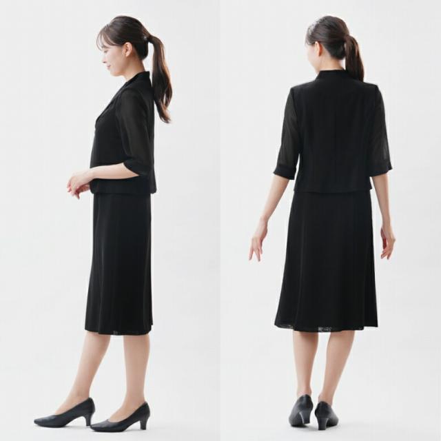 日本製 夏用 ブラックフォーマル アンサンブル風ワンピース レディース 婦人 礼服 喪服:RL109556【米沢織】 9号/11号/13号/15号 黒 前開き サマーフォーマル