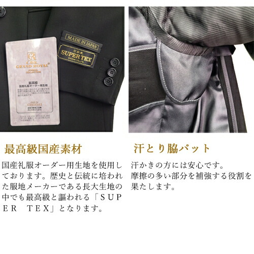 | ポイント | 長大最高級オーダー用生地使用(SUPER TEX)/濃染加工(ウルトラブラック)/ 本格毛芯仕立て/抗菌防臭加工/ ホコリ防止加工 |