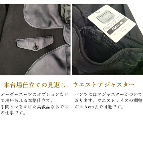 | デザイン | ジャケット: ダブル4釦1掛け/ノーベンツ/背抜き半裏/見返し本台場仕立て/パイピング始末/脇差し/祝儀袋&マルチポケット パンツ: ワンタック/アジャスター付き・スラックスのウエスト実寸法±6cmは調整可能 |
