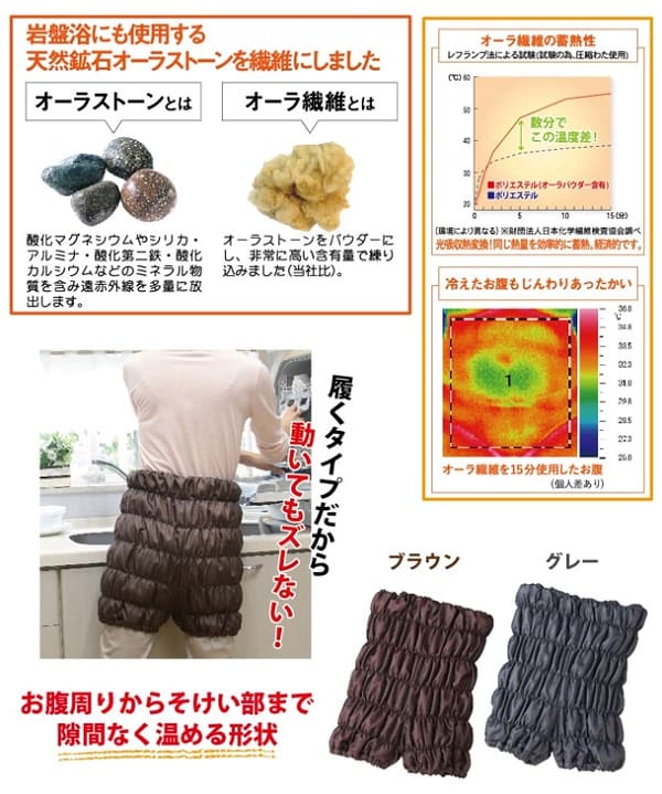 ・岩盤浴で使われている天然鉱石を練り込んだオーラ繊維がお腹から下腹部をじんわり心地良く温めます。