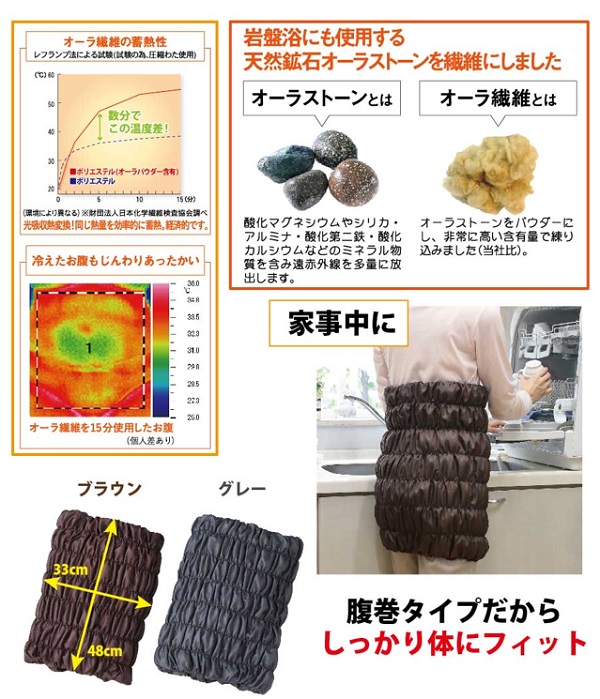 ●岩盤浴で使われている天然鉱石を練り込んだオーラ繊維が、お腹と腰をじんわり心地良く温めます。●電気を使用しないのに、冷えをしっかりサポートするECOアイテム!