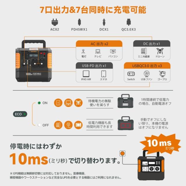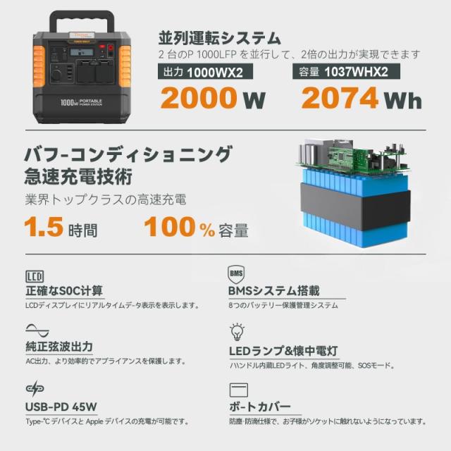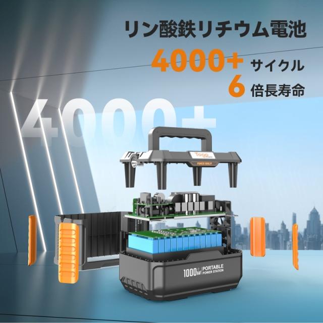 TogoPower 1000W ポータブル電源 瞬間最大出力2000W 大容量 ポータブルバッテリー 1037Wh MPPT制御 非常用電源 蓄電池 家庭用 バックアップ電源 防塵 純正弦波 フル充電 SOS機能 車中泊 キャンプ 節電対策 防災グッズ