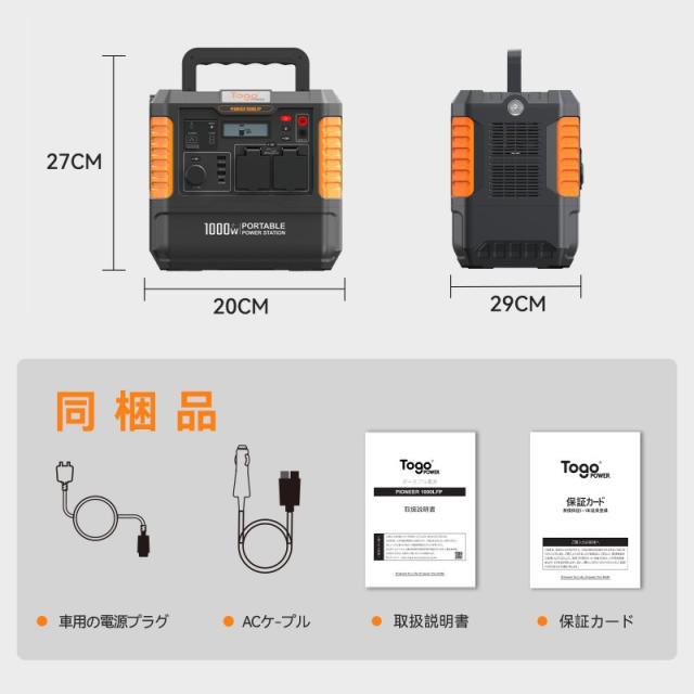 【TOGO POWER PIONEERシリーズ ポータブル電源1000W 瞬間最大2000W ポータブル電源 リン酸鉄 大容量 1037Wh 家庭用蓄電池 純正弦波AC430W /ワイヤレス充電/USBQC3.0/PD 45W/DC出力 ハンドルライト/SOS発信/懐中電灯 ソーラー充電 50H/60Hz 4Way充電 車中泊 キャンプ 地震停電 防災グッズ 非常用電源 持ち運びやすい 外出 両親へのプレゼント 父親へのプレゼント 母親へのプレゼント 防災 停電時 災害時 停電対策 バッテリー 旅行行く実家 災害対策】